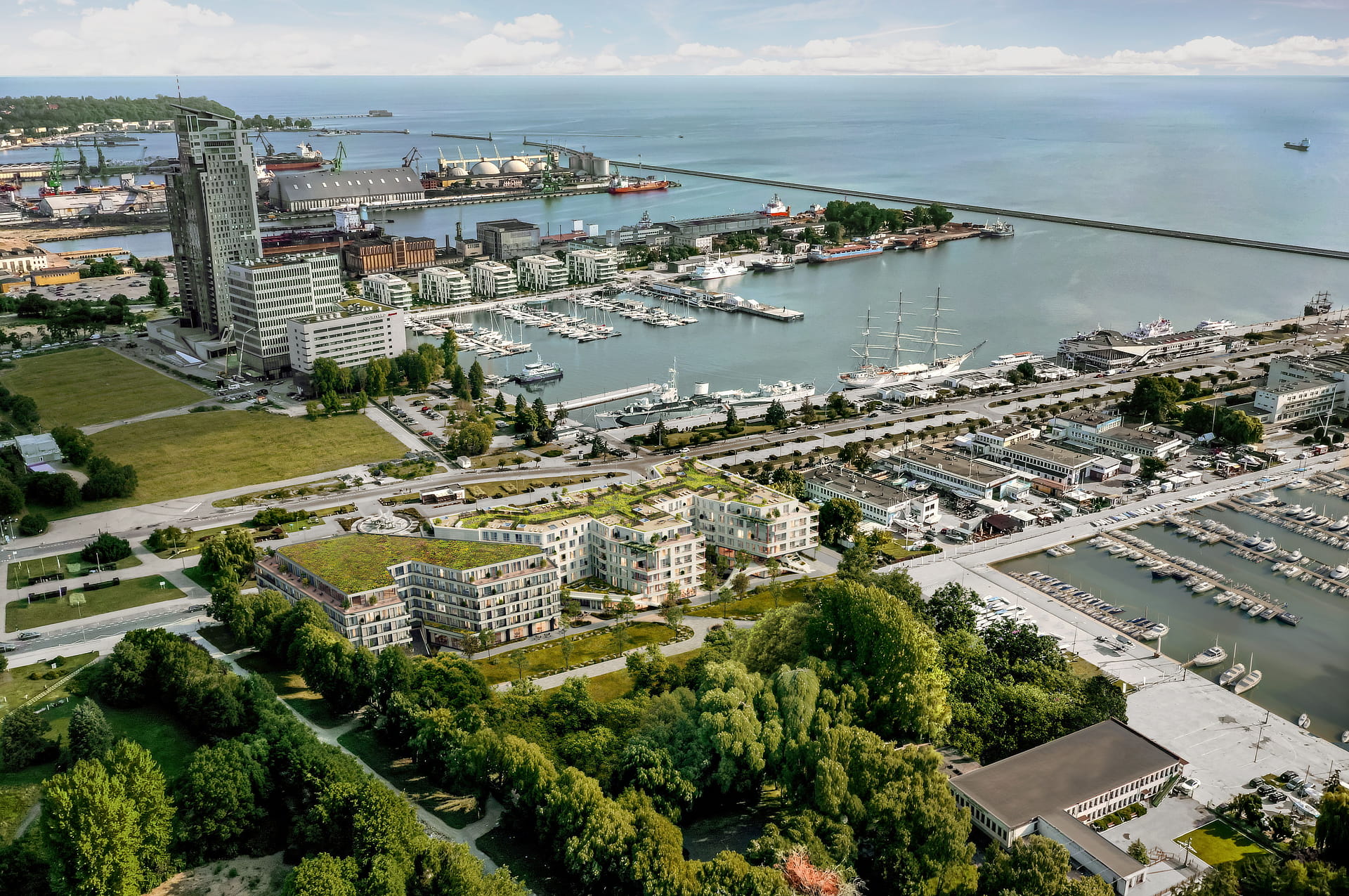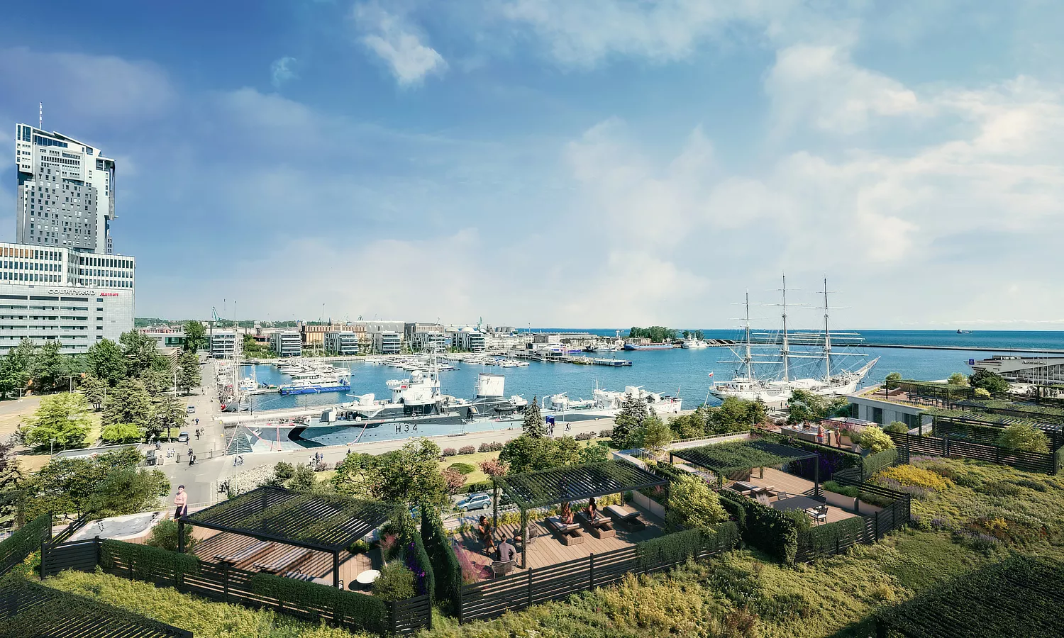 This unique location offers views of the Presidential Basin, featuring the museum ships "Błyskawica" and "Dar Pomorza." It is situated near Poland's most famous marina and close to Gdynia city beach, which provides a stunning panorama of the Gulf of Gdansk.