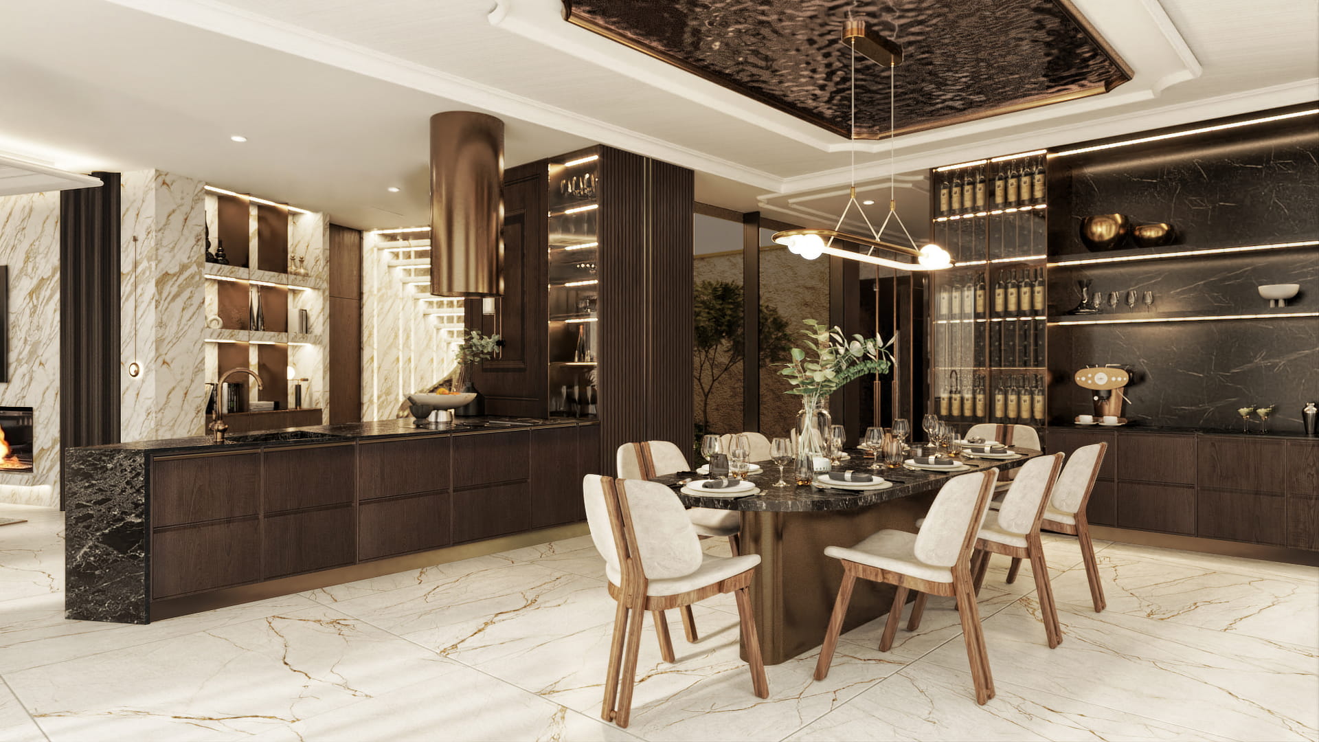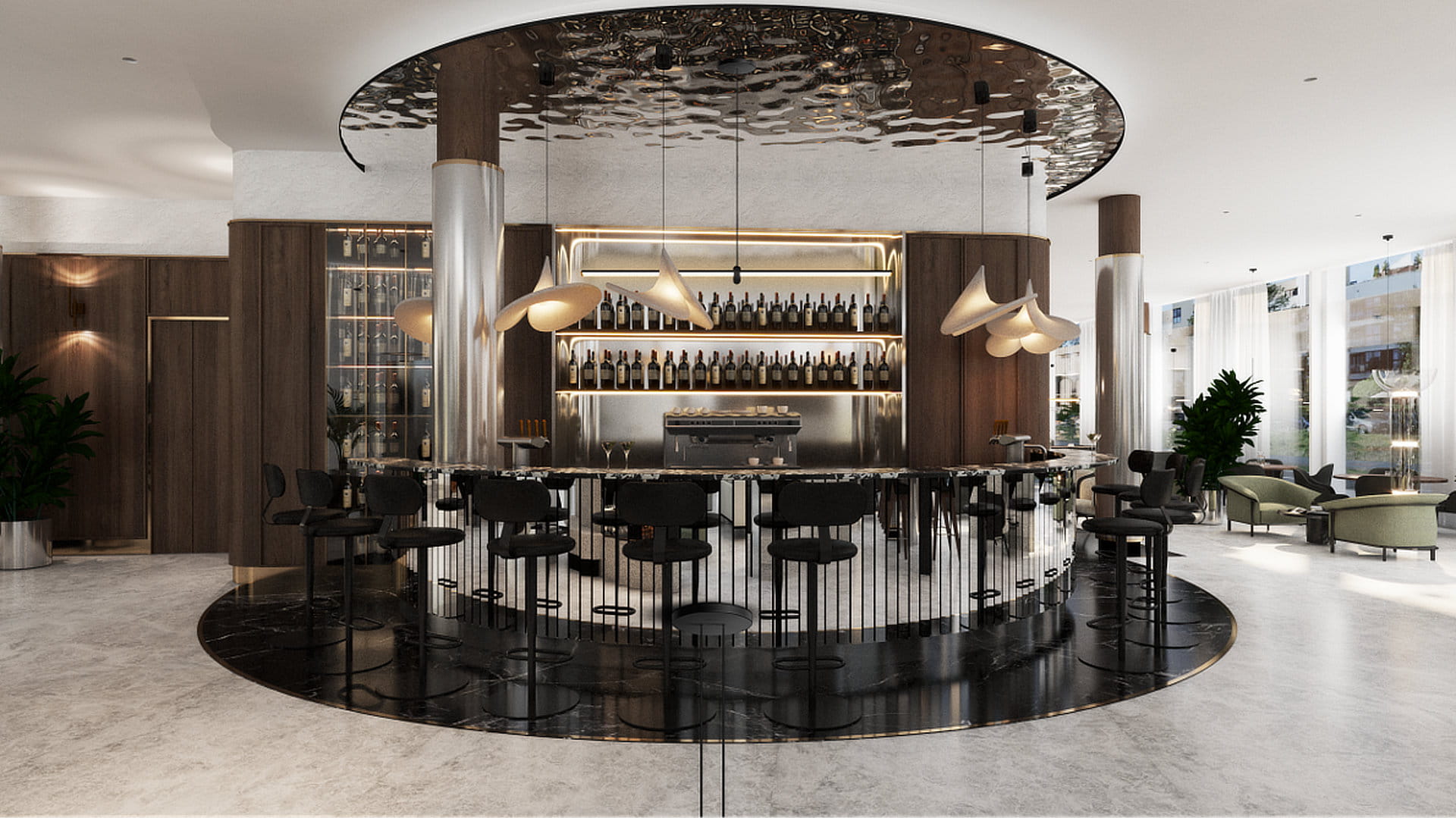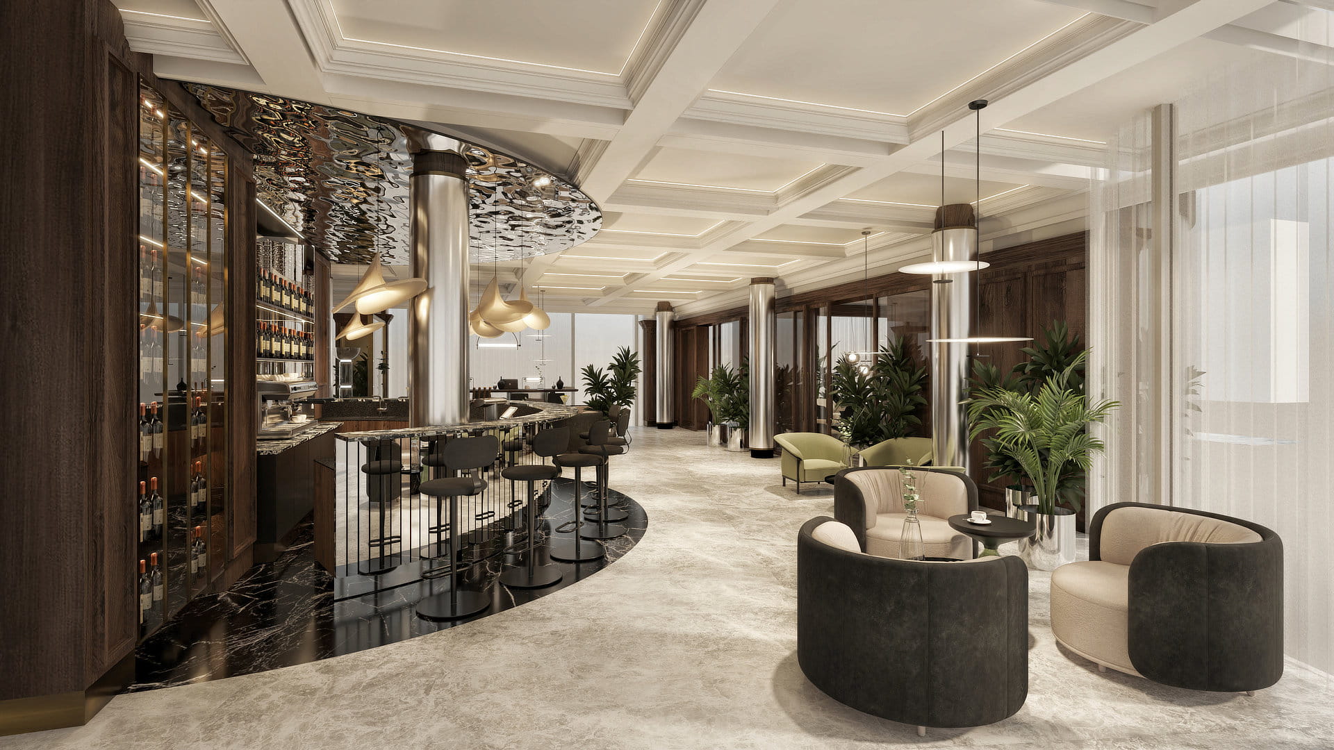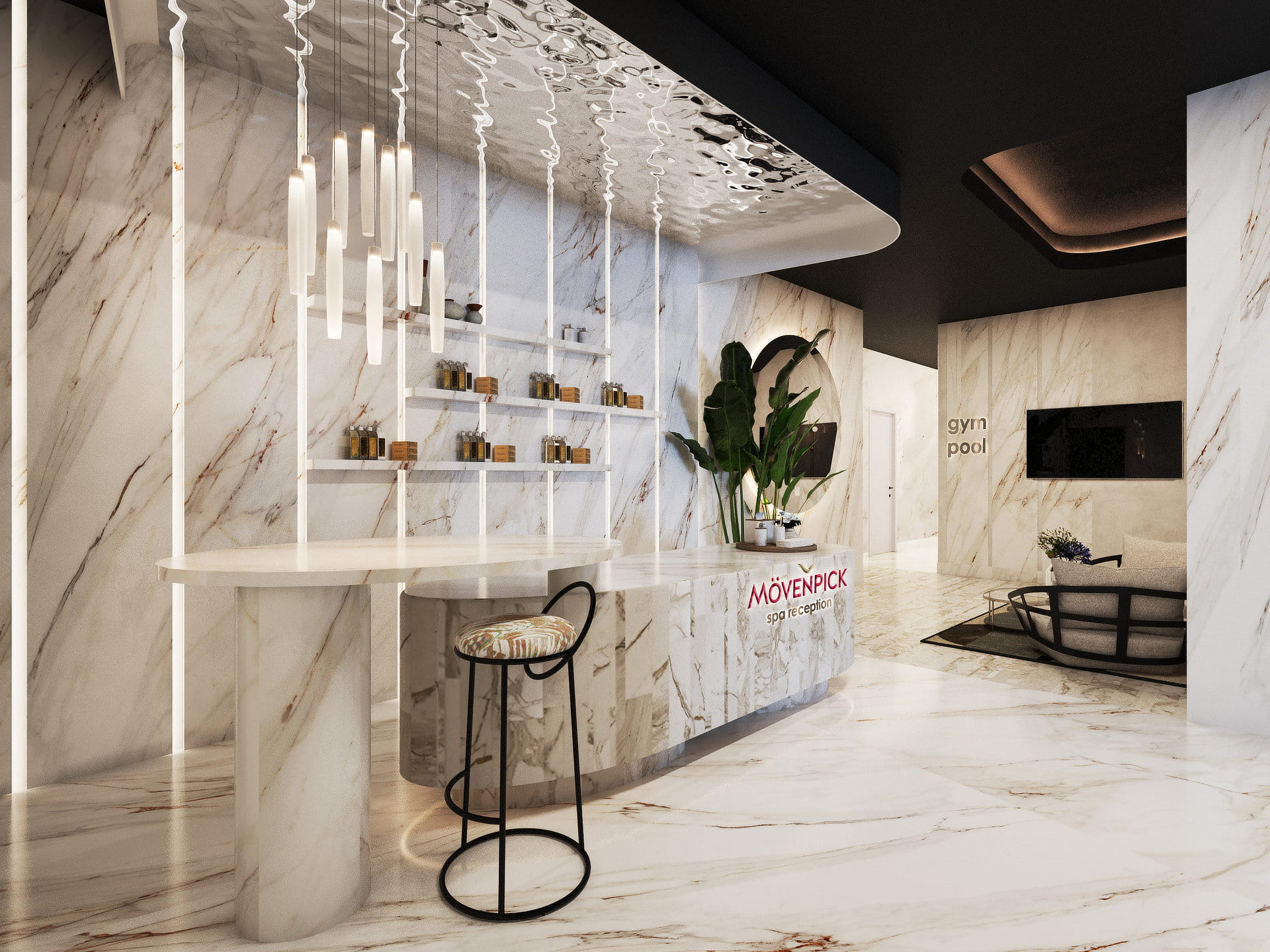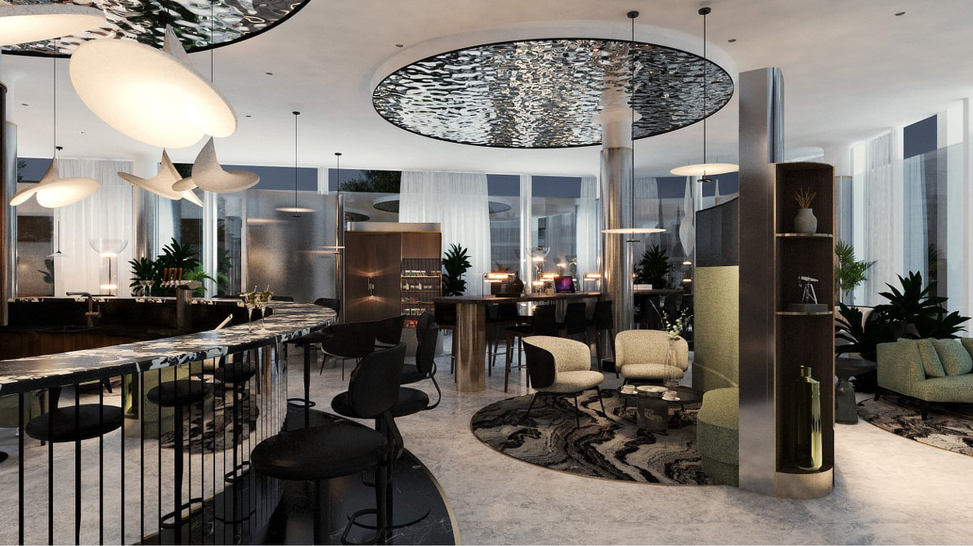 Notably, a wave-shaped staircase enhances the gastronomic area on the first floor, providing seating along the sides and offering stunning views of the marina and beach.